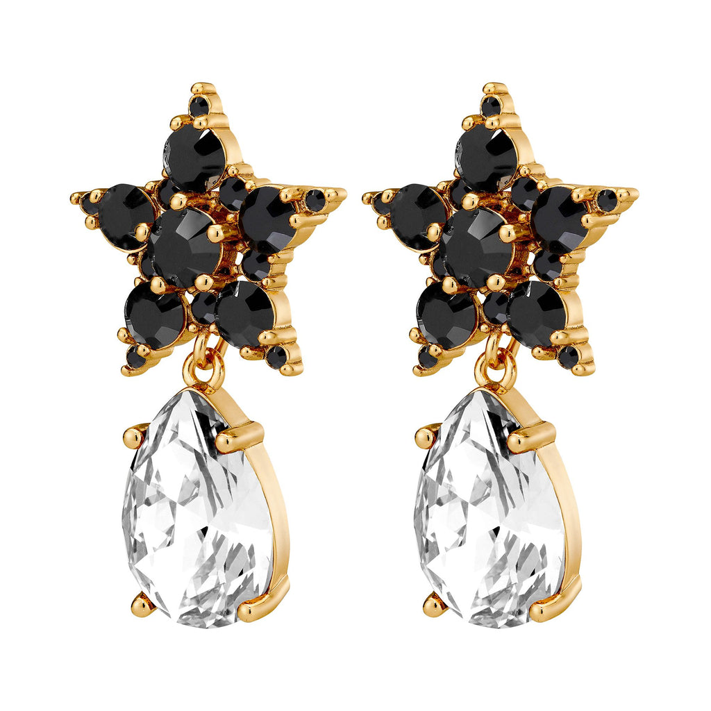 HYDRA - is an amazing stud earpost - shaped in the shape of a star with a drop crystal pendant. The earring is lavishly set with multible facet cut crystals in a symmetrical pattern. Here shown in gold tone with black crystals . Appr. length 32 mm. An elegant and playful style, great for a night out. Designed in polished brass by DYRBERG KERN - and totally stunning. DANISH DESIGN.
