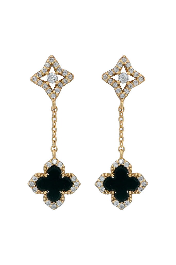 Crafted from 18k gold e-coated 925 sterling silver, these stunning earrings feature a delicate yet bold combination of elements from the Fairwater collection. At the top, the Petite stud measures 7.94mm wide, offering a subtle sparkle that sets the stage for the striking Fairwater black agate clover, which measures 9.15mm wide.