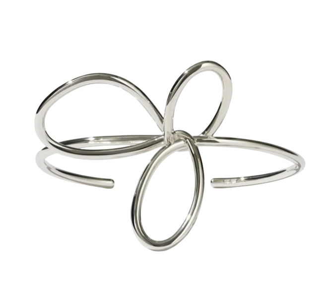The classic flower symbol, stripped back and blown up. A single piece of silver wire looped and manipulated into oversized petals that swirl and undulate against the wrist.