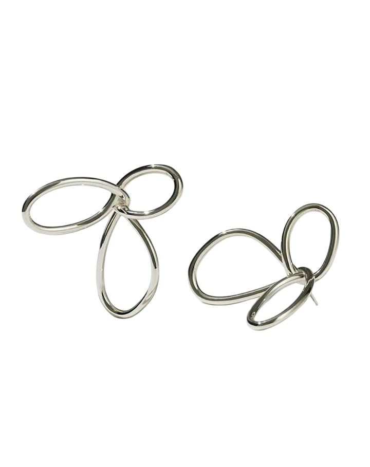 The classic flower symbol, stripped back and blown up. A single piece of silver wire looped and manipulated into oversized petals that swirl and undulate from the soft of the earlobe to the curve of the jaw.