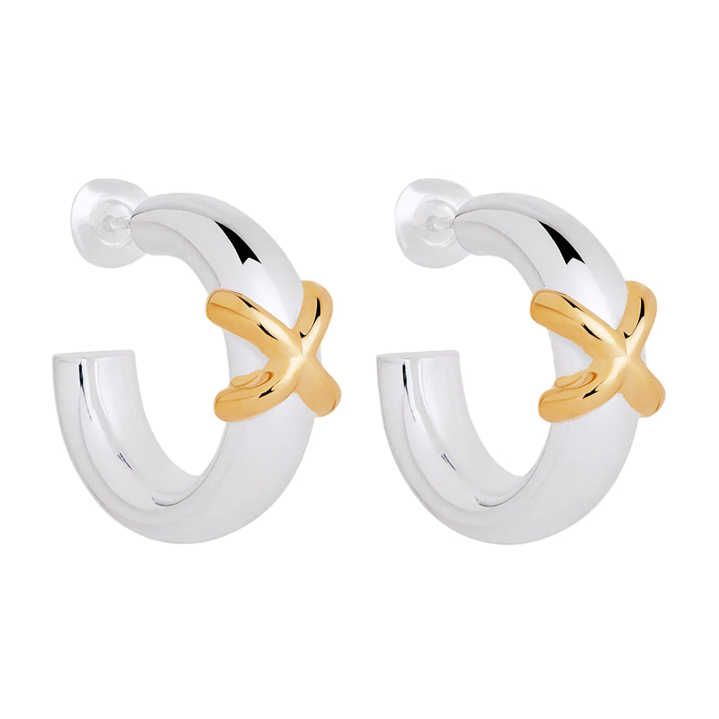 These sculptural earrings immortalise the universal icon for a kiss with a beautiful encircling hug. Their sterling silver oval hoops feature a raised yellow gold plated ‘X,’ creating a stunning two-tone look. Affectionate and playful, these understated hoops are gorgeous for gifting or to wear as a reminder of someone you want to wrap your arms around with love.