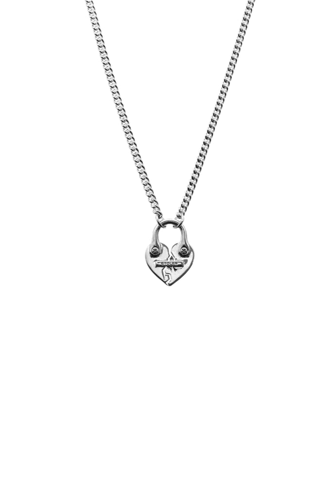 Fractured Love Necklace crafted in high polish sterling silver. Our broken heart is bound together by a branded Stolen bar and hung on a curb chain.