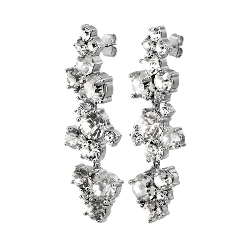 Elegant yet unapologetically extravagant, the Mayhem shiny silver earrings are designed to command attention. Featuring a mix of smaller and larger round, facet-cut crystal chatons arranged in an asymmetrical, almost chaotic pattern, this striking design plays with light, texture and movement. The articulated mid and lower sections move freely, creating dramatic sparkle with every step.