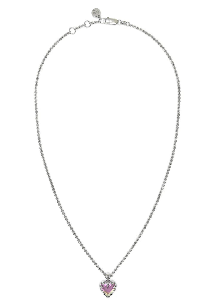 The Love Claw Necklace captures the signature claw motif in a refined pendant form. At its centre sits a heart-cut iridescent Mystic Quartz, chosen for its shifting violet and green tones that change subtly as the stone catches the light.